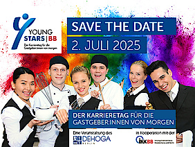 YoungStarsBB - der Karrieretag der Gastgeber:innen von morgen ist unser Tag speziell für die Auszubildenden des Gastgewerbes. Im Jahr 2025 wird er auch wieder im Juli stattfinden und den Azubis einen spannenden Tag vollgepackt mit praktischen Workshops, Wissen, Fun & Action-Points sowie mit F&B-Stationen bieten. Merken Sie sich den Termin schon jetzt in Ihren Kalender vor. Die Anmeldeseite wird im Mai freigeschaltet. Es gilt dann: first come – first served.